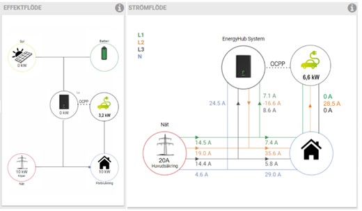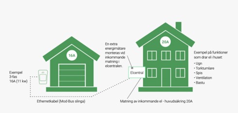Notera att elbilen laddar mer än vad huvudsäkringen ”klarar av” tack vare fasbalansering. OBS. Bilden är ett montage
