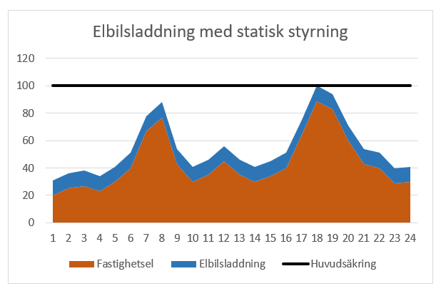 Nästa steg mot exemplet ovan är att man ställer ned laddeffekten i laddstolpen statiskt. Dvs att man exempelvis endast plockar ut 8A, ur en laddstolpe som klarar att mata ut trefas 16A. Då finns det mer kapacitet till övriga hushållet och sannolikheten att huvudsäkringen löser ut minskar. Men, eftersom ingen styrning finns räcker det att bastun körs samtidigt som man lagar mat och man laddar elbilen för att det skall blir becksvart hemma igen.