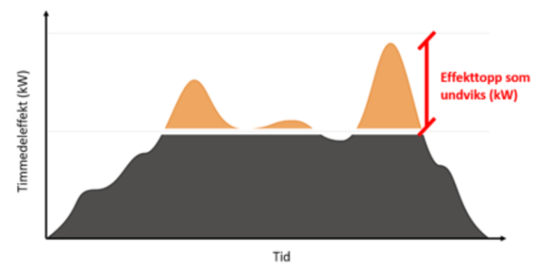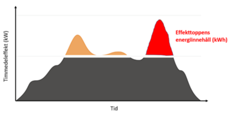 Då ett batteri har både en effekt och en energi, så har också effekttoppen det. Höjden på effekttoppen är effekten, dvs man måste ha ett tillräckligt kraftfullt batteri för att kunna ta hand om hela toppen.