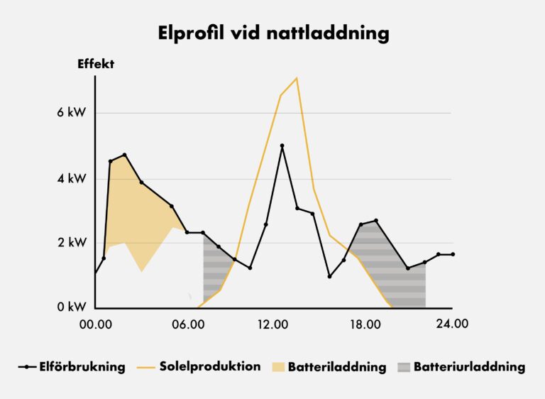 Då nattladdning tillämpas laddas batteriet upp under ett antal timmar efter kl 00:00 för att sedan vara fulladdat till frukost för att då ladda ur. Under dagen tar solcellerna hand om eventuella laster och laddar batteriet. Framåt kvällen kan en urladdning ske för att undvika timmarna med de högsta priserna på kvällen.