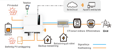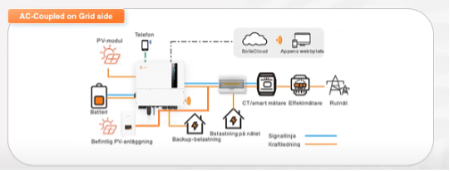 Om batteriet måste installeras på en annan plats än den befintliga strängväxelriktaren så behöver man ha den separat smartmätare på den befintliga strängväxelriktaren. Denna ansluts till hybridväxelriktaren (dvs man använder dubbla smartmätare).